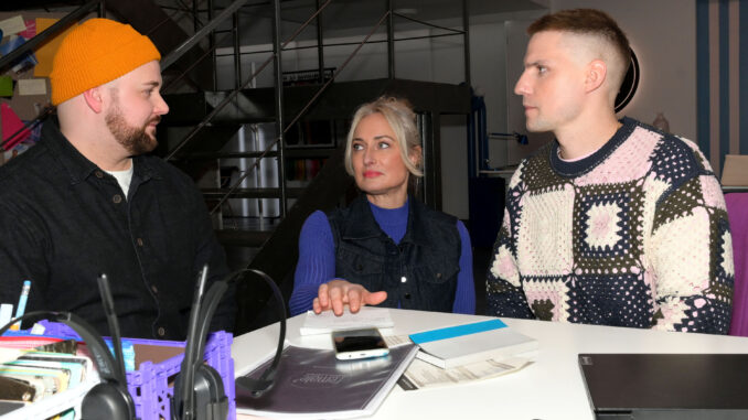 Jonas (Felix van Deventer, l.), Maren (Eva Mona Rodekirchen) und Moritz (Lennart Borchert) überlegen, wie sie dem obdachlosen Mats zu einer Wohnung verhelfen könnten. (Foto: RTL / Rolf Baumgartner)